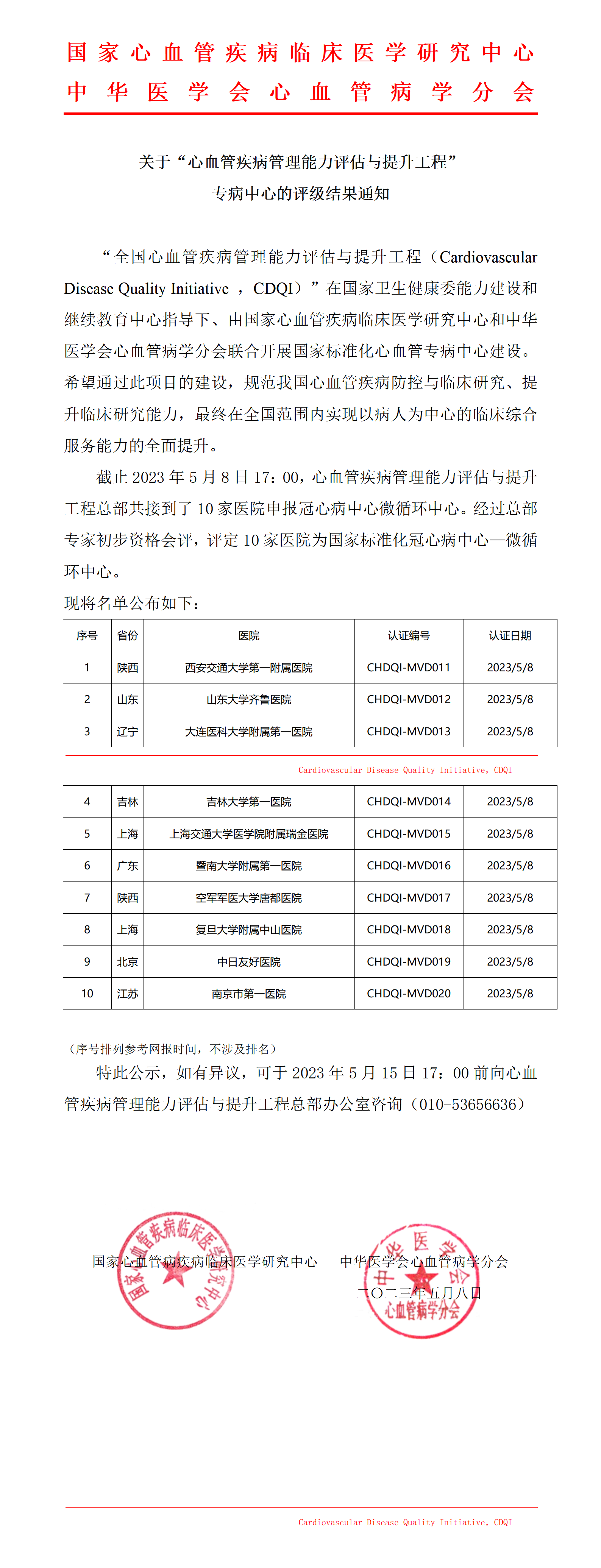 关于国家标准化冠心病微循环中心中心评级结果通知