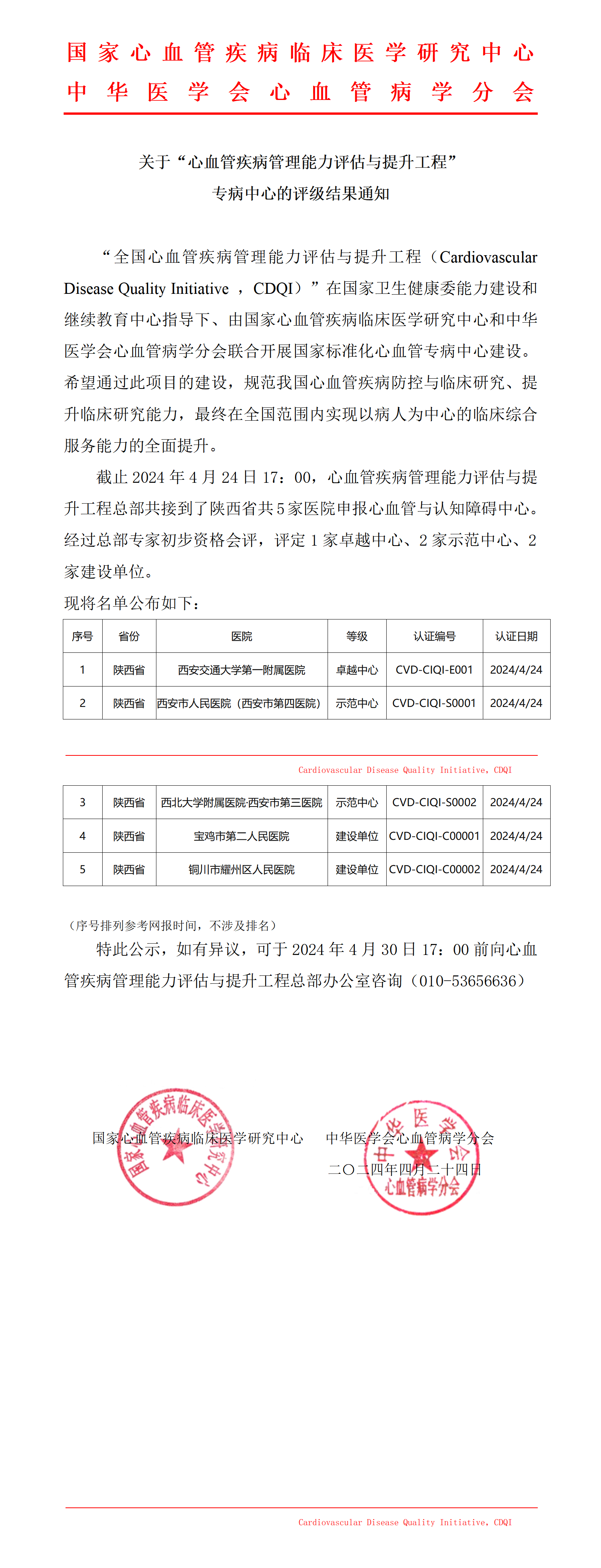 关于国家标准化心血管与认知障碍中心评级结果通知-陕西省