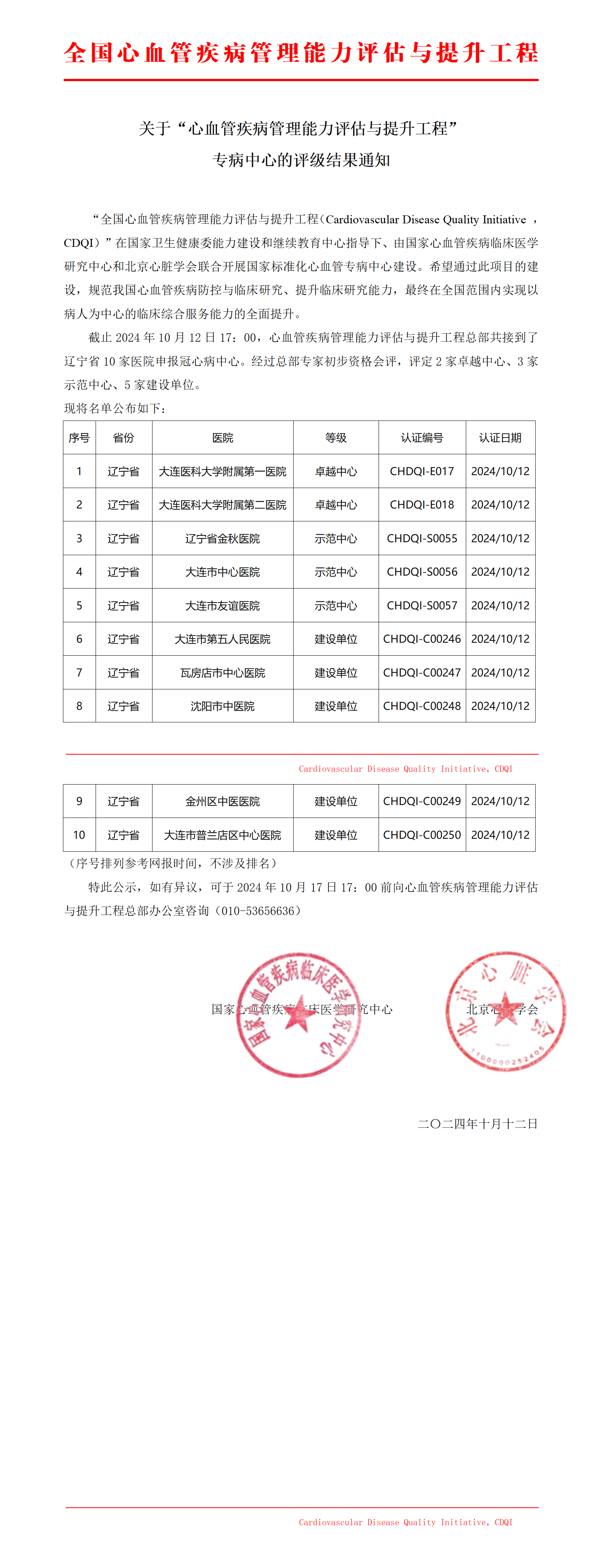 关于国家标准化冠心病中心评级结果通知-辽宁省