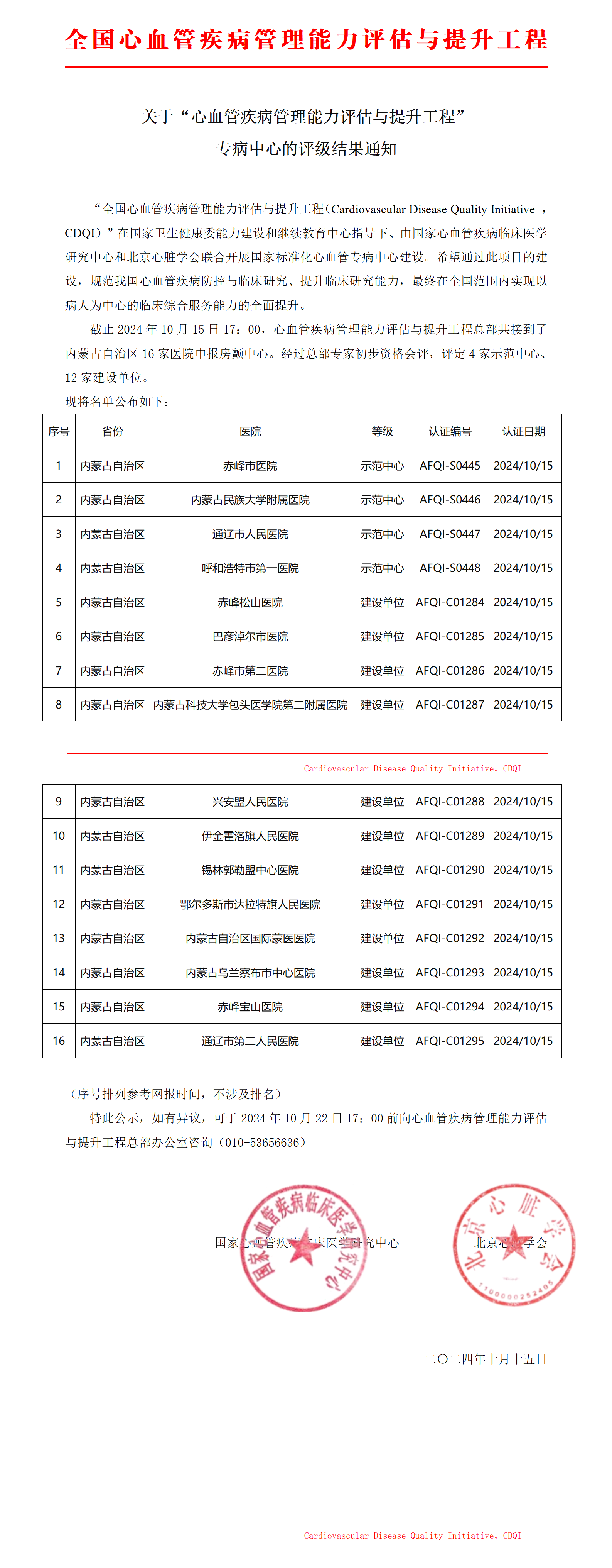 关于国家标准化房颤中心评级结果通知-内蒙古自治区