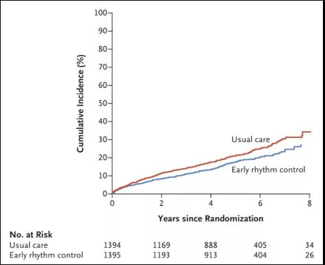 平均随访5.1年,早期节律控制治疗组中249例患者出现主要终点事件,常规治疗组中316例患者出现主要终点事件。早期节律控制组患者主要终点事件发生率更低(HR=0.79;95%CI 0.67~0.94;P=0.005)。早期节律控制组的绝对风险降低为1.1%/年。