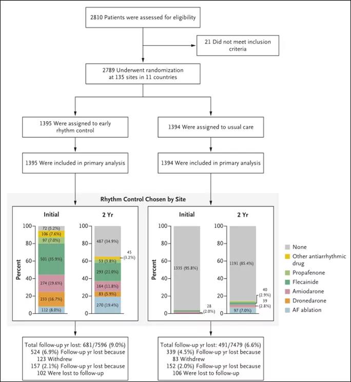 2011年至2016年期间,研究共纳入了来自11个国家135个中心的2789例房颤患者,受试者合并至少两种心血管疾病。按1:1的比例随机接受早期心律控制治疗或常规治疗。两组患者均接受心血管疾病基础治疗、抗凝治疗,以及指南推荐的室率控制治疗。早期节律控制组患者,接受抗心律失常药物或导管消融治疗(由各中心研究小组选择),当记录到房颤复发时,节律控制治疗逐步升级。常规治疗组患者,采用室率控制治疗,这组患者只有在经过最佳室率控制治疗后,仍有严重房颤相关的症状时,方可考虑接受节律控制治疗。