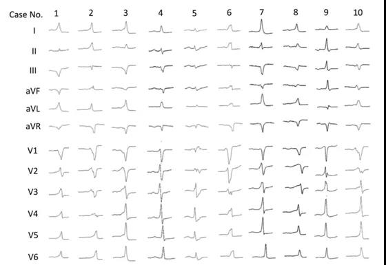 此外,这类患者在窦性心律时均表现为显性预激,体表心电图形态如下图所示。与连续纳入的30例典型右侧游离壁旁路患者相比,此类患者P-R间期较长且QRS波时限较短,同时V1导联更常表现为QS型,这一发现有助于术前对这一类型的旁道进行初步诊断。