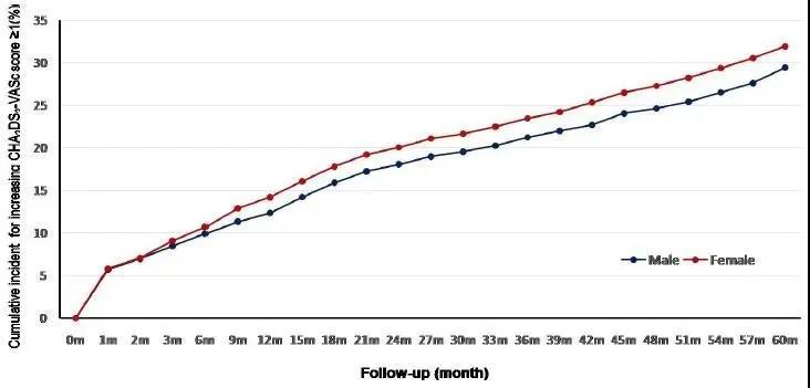 图1. CHA2DS2-VASc评分增加≥1分的累计情况。
