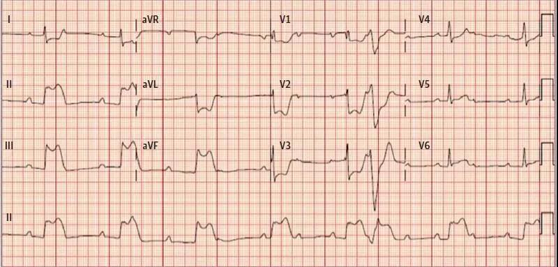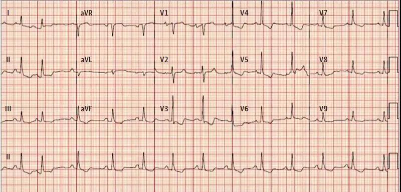 患者病情危急,遂呼叫心内科医生,预行急诊心导管检查。在患者等待被送往导管室期间,在进行任何干预之前、第一次描记心电图6分钟后,再次描记心电图,显示窦性心律,之前的完全性AVB和ST段异常图形缓解(图2)。